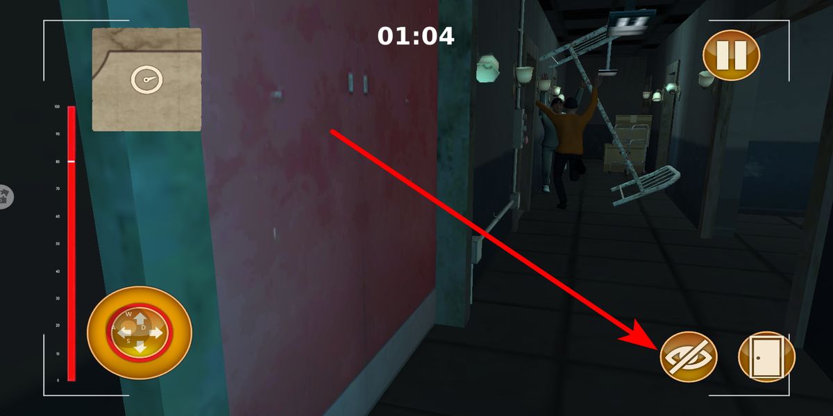 3、關(guān)卡挑戰(zhàn)時操作,左下角圓盤控制移動方向,右下角有隱形、開門按鈕,遇敵人時,點(diǎn)隱形按鈕可短時間隱藏,避開敵人追捕,找門點(diǎn)擊開門按鈕嘗試逃離過關(guān)。