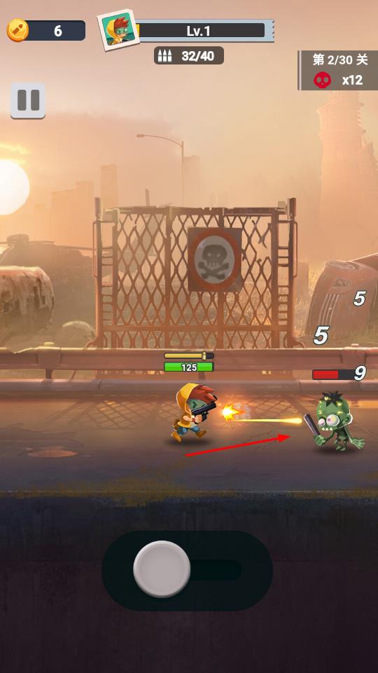 2、自動(dòng)射擊消耗彈藥,擊敗僵尸獲金幣、經(jīng)驗(yàn),提升等級(jí)戰(zhàn)力,推進(jìn)關(guān)卡。