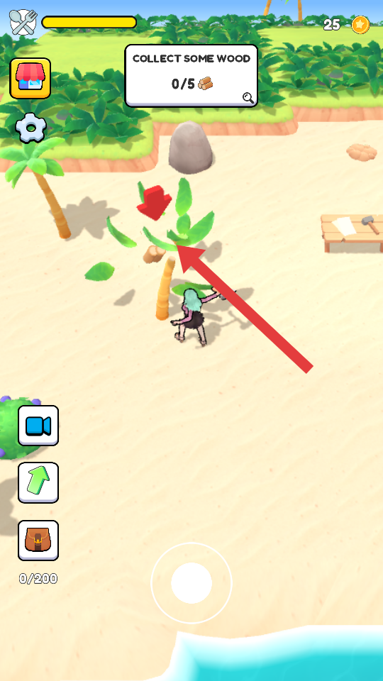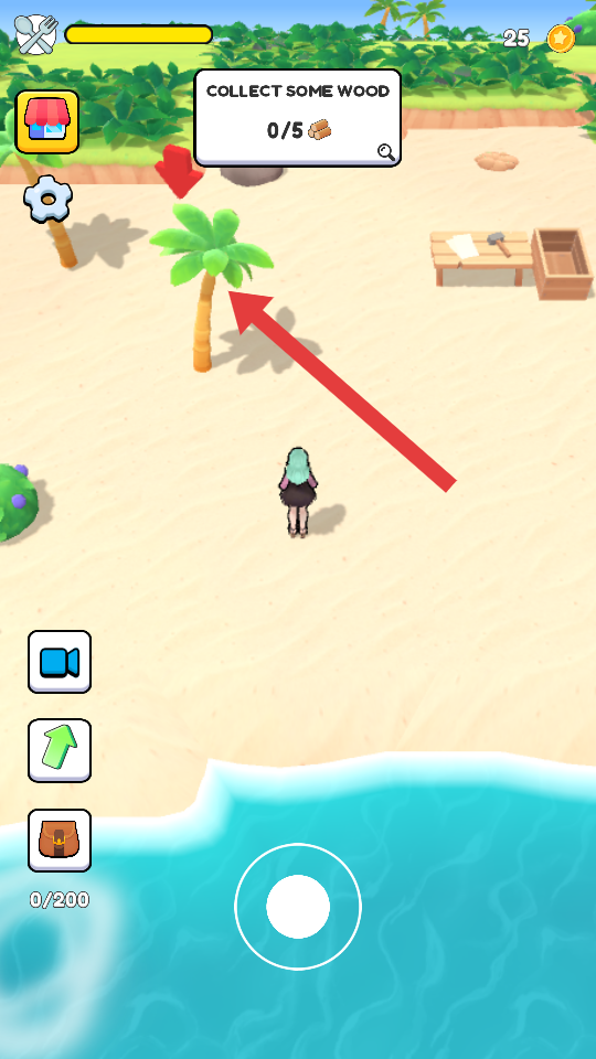 1、進(jìn)入游戲后,留意上方任務(wù)提示操控角色移動(dòng)至目標(biāo)資源點(diǎn)椰子樹的區(qū)域,點(diǎn)擊交互的按鈕。