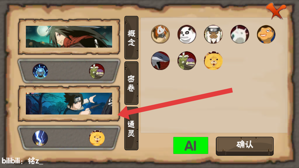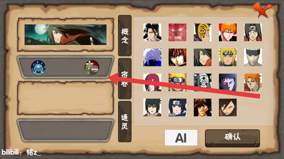 1、角色與配置選擇,在選人界面選定穢土斑,搭配適配密卷如增加傷害,通靈補充輸出或者反手,點擊確認(rèn)進入戰(zhàn)斗。