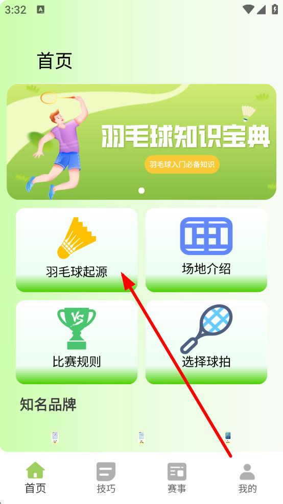 1、進(jìn)入首頁,點(diǎn)擊羽毛球起源,可查看羽毛球起源相關(guān)內(nèi)容。