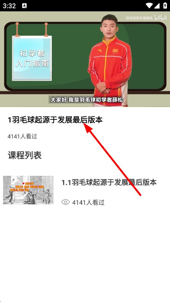 2、在羽毛球起源頁面,可觀看羽毛球起源于發(fā)展最后課程視頻。
