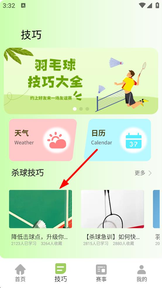 3、進(jìn)入技巧頁面,可查看“殺球技巧”等相關(guān)羽毛球技巧內(nèi)容。