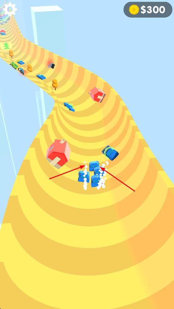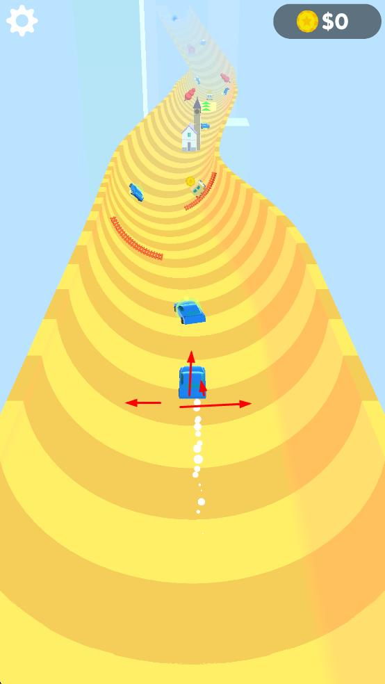 1、操控小車(chē)左右移,沿螺旋軌道行駛,避障、碰金幣與車(chē)輛。