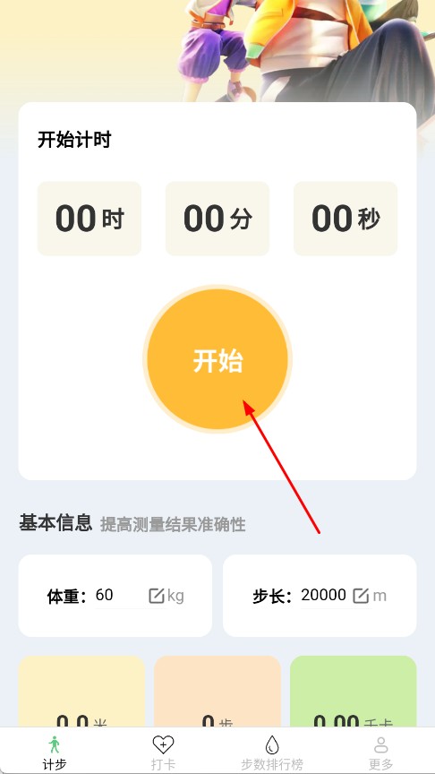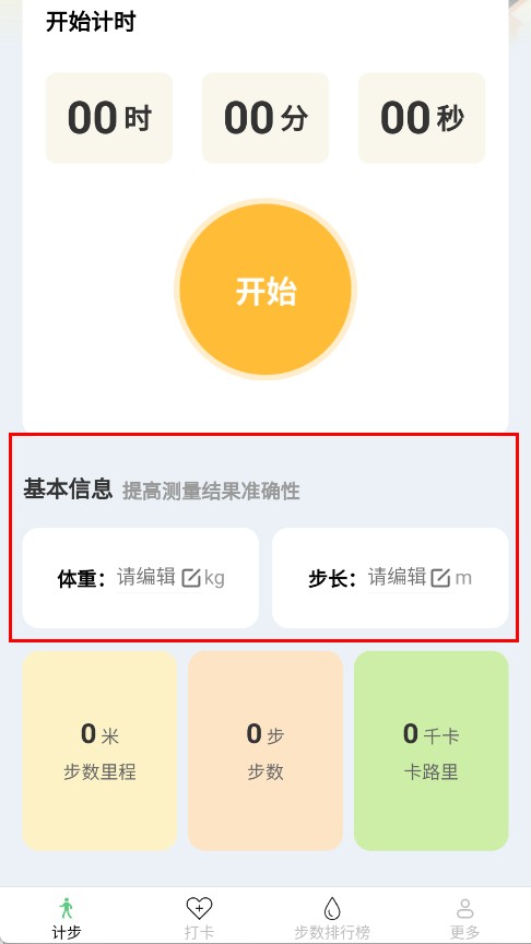 3、點擊計時區(qū)的開始,開啟運動計步,記錄步數、里程等數據。