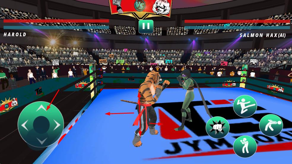 1、進(jìn)入格斗賽場(chǎng),操控左側(cè)虛擬搖桿移動(dòng)角色,調(diào)整與敵方的站位。
