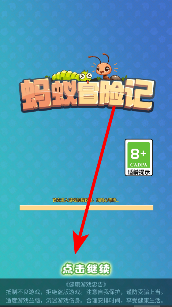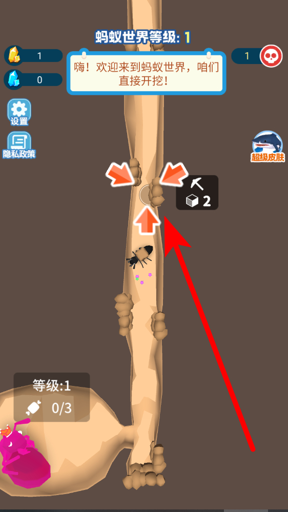 1、開局引導(dǎo)進入游戲點擊點擊繼續(xù),跟隨提示熟悉界面,螞蟻世界初始等級為1,屏幕中央箭頭標記可挖掘區(qū)域,點擊土塊即可啟動蟻穴拓展,掌握基礎(chǔ)操作邏輯。