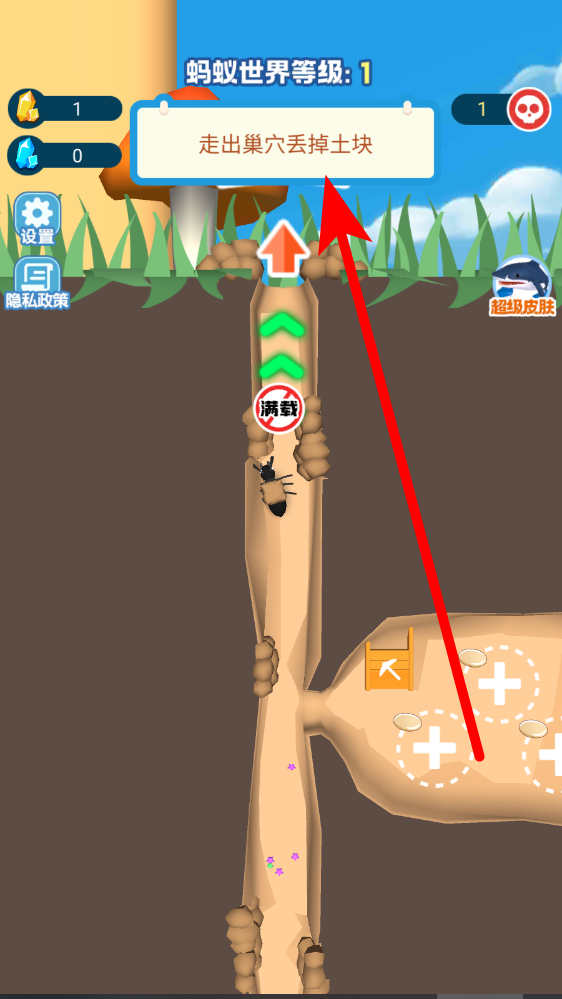 3、運土流程當螞蟻滿載土塊,跟隨向上箭頭指引前往巢穴出口,將土塊丟棄至地面,完成運輸后返回蟻道繼續(xù)挖掘,通過反復(fù)運土擴大蟻穴空間,推動蟻群成長。