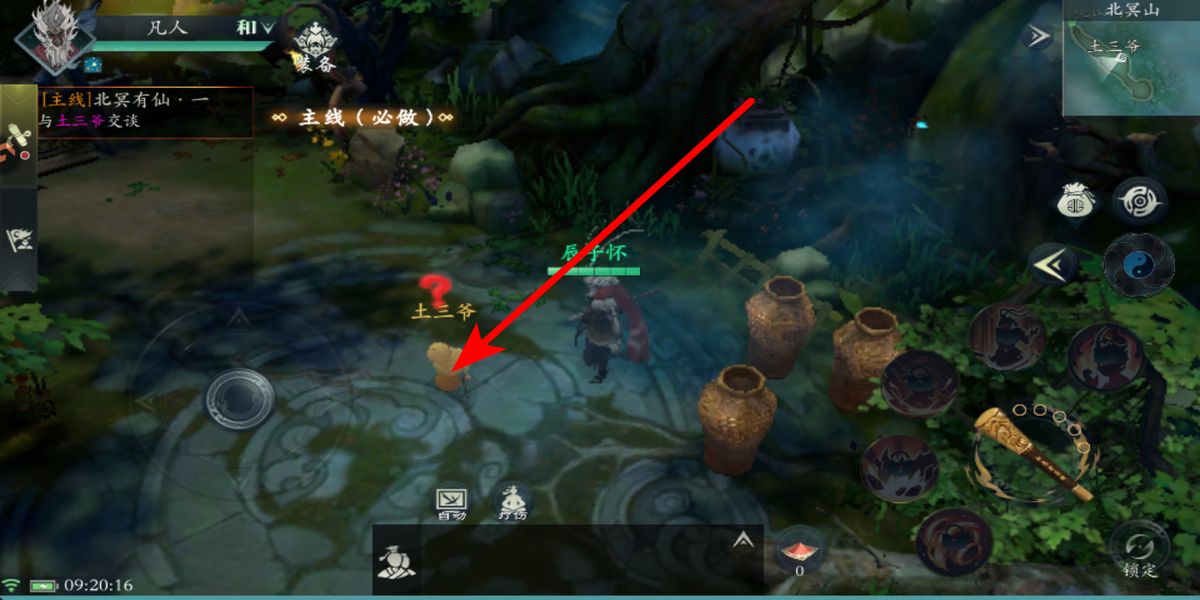 2、進(jìn)入北冥山場景后,尋找?guī)в凶仙蝿?wù)標(biāo)識字的土三爺,該標(biāo)識代表可交互NPC,靠近角色后即可觸發(fā)對話選項,準(zhǔn)備推進(jìn)任務(wù)劇情。