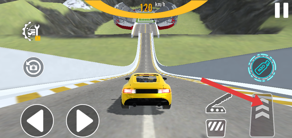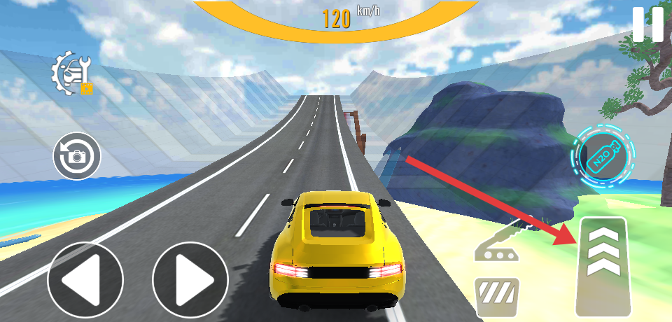 2、右側(cè)的氮?dú)釴?O按鈕在能量攢滿之后點(diǎn)擊,可讓賽車瞬間加速?zèng)_坡,能夠利用開闊的場地練習(xí)漂移技巧。