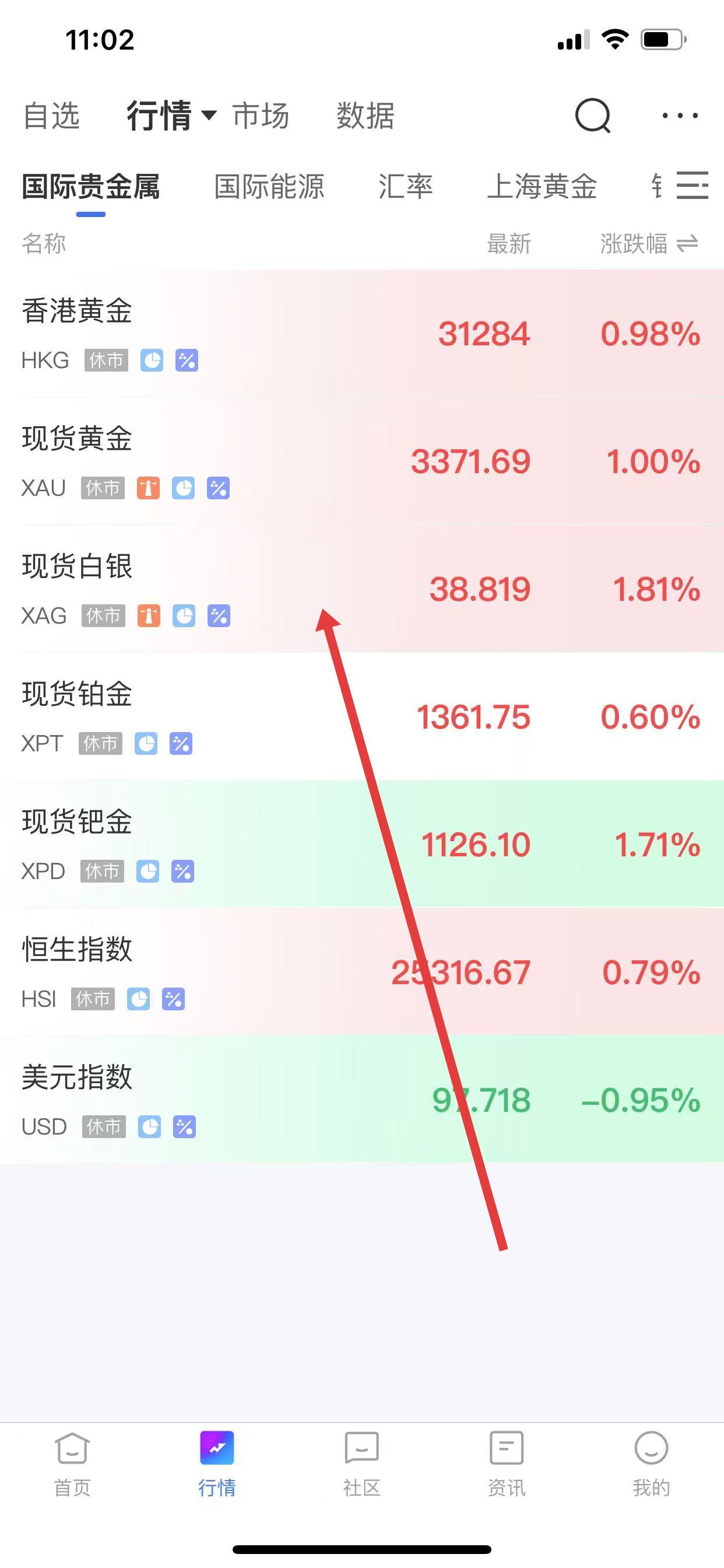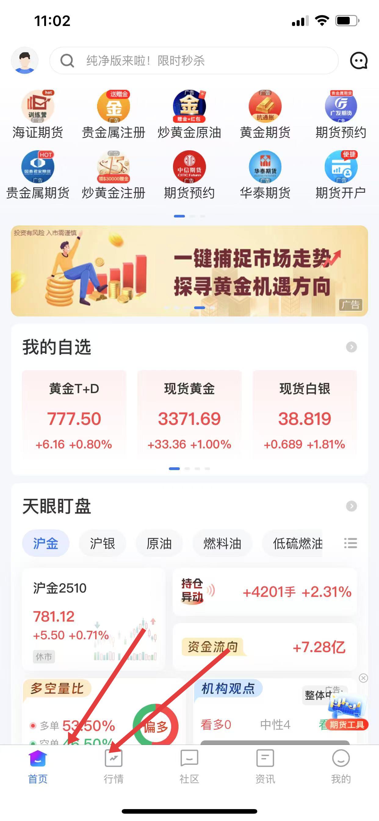 1、打開金投網(wǎng)應(yīng)用,進(jìn)入首頁,點(diǎn)擊底部導(dǎo)航欄中的行情按鈕,進(jìn)入行情頁面。