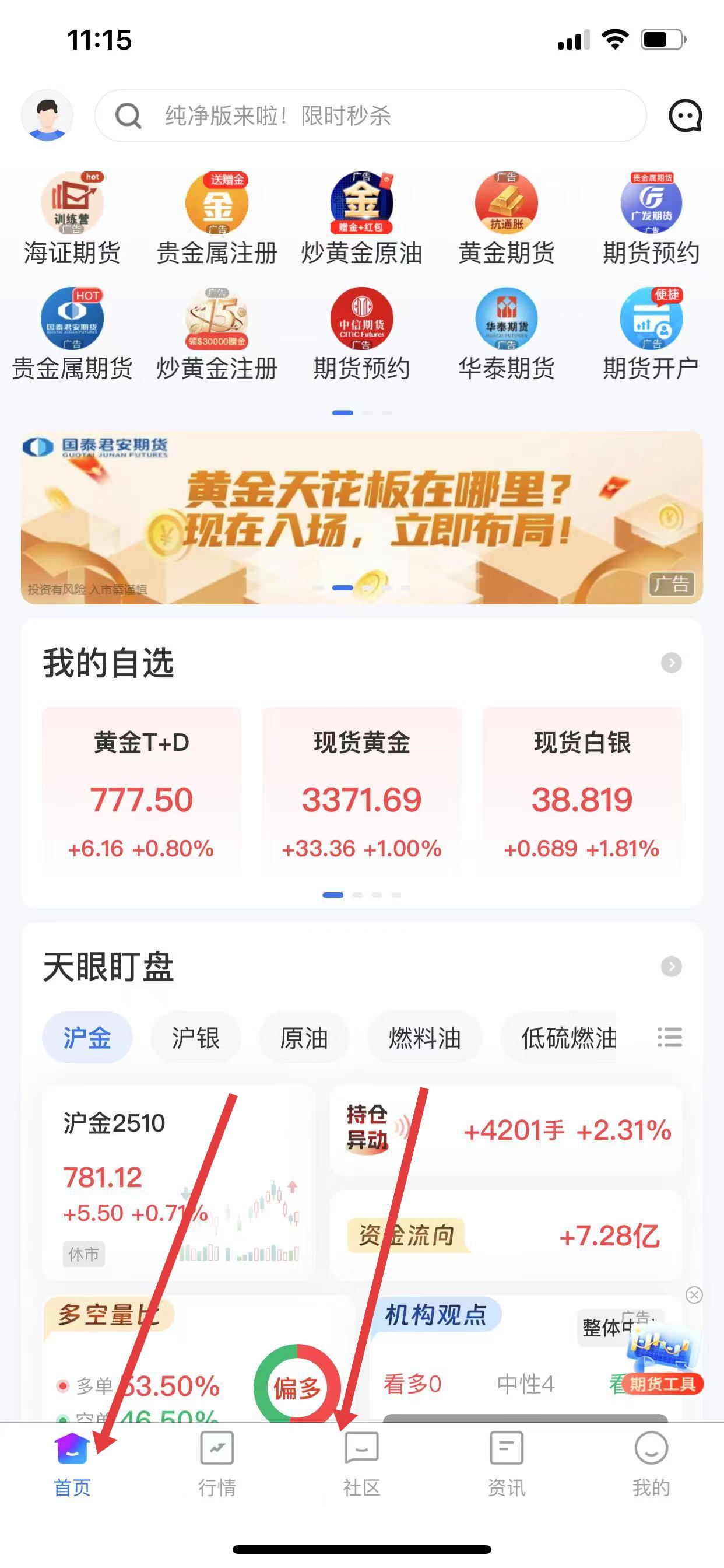 1、打開(kāi)金投網(wǎng)應(yīng)用,進(jìn)入首頁(yè),點(diǎn)擊底部導(dǎo)航欄中的社區(qū)按鈕。