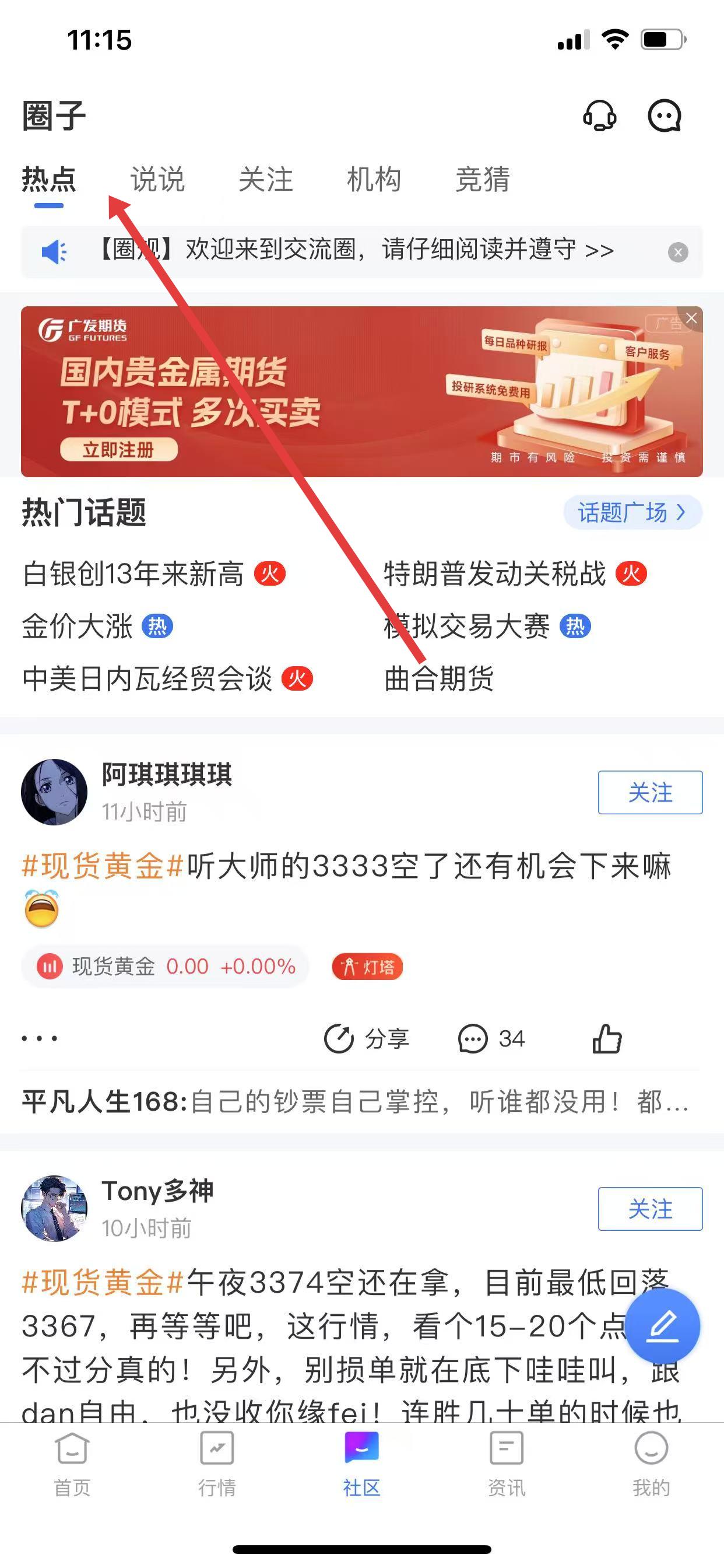 2、進(jìn)入社區(qū)后,在上方選項(xiàng)卡點(diǎn)擊熱點(diǎn),查看當(dāng)下熱門(mén)投資話題。