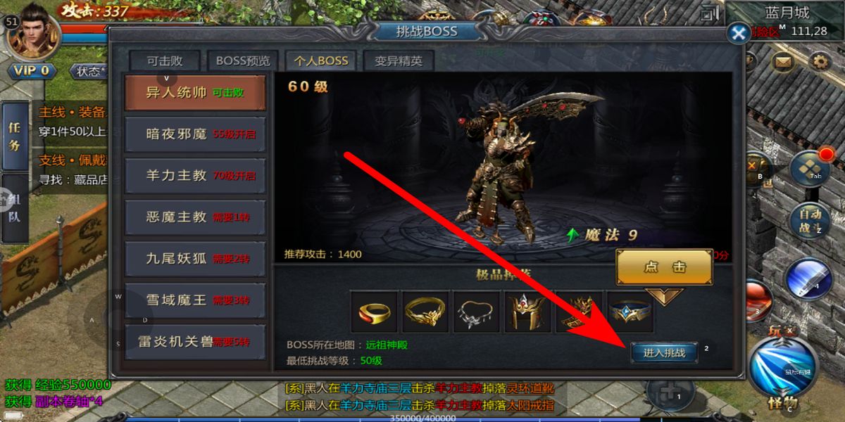 3、挑戰(zhàn)BOSS玩法打開(kāi)挑戰(zhàn)BOSS界面,選擇可擊敗的異人統(tǒng)帥,滿足等級(jí)等條件后點(diǎn)擊進(jìn)入挑戰(zhàn),戰(zhàn)勝BOSS掉落極品裝備,提升戰(zhàn)力。