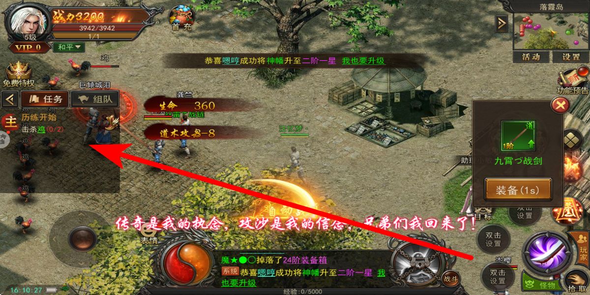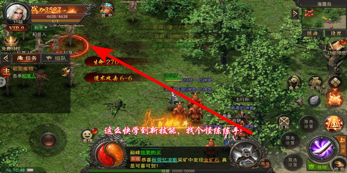 1、接取初始任務(wù)歷練開始,前往落霞島擊殺雞怪,開啟自動戰(zhàn)斗功能可高效完成,任務(wù)獎勵基礎(chǔ)裝備與資源,助力前期屬性提升。