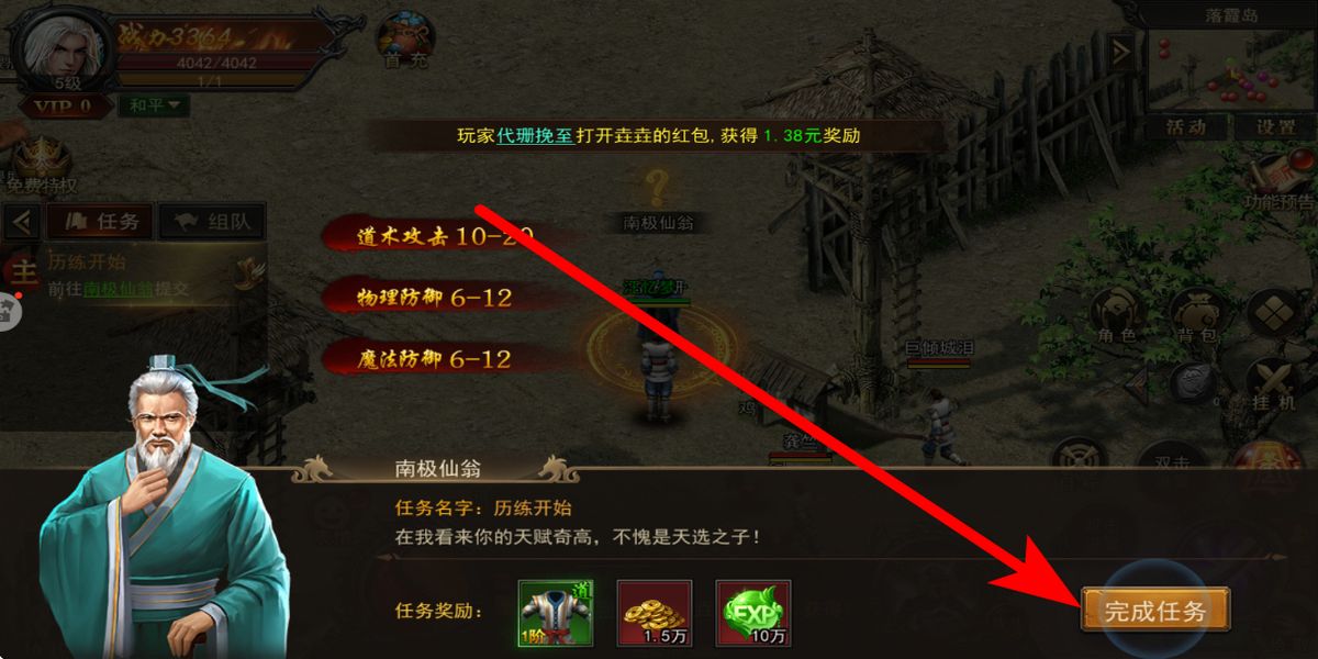 2、完成雞怪擊殺后,與南極仙翁對話提交任務(wù),獲取經(jīng)驗(yàn)金幣與新裝備,解鎖后續(xù)初面魔物任務(wù),逐步推進(jìn)角色成長線。
