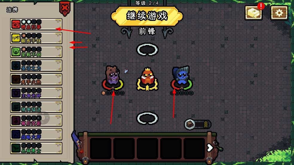 2、打開連攜界面,搭配左側(cè)嗜血狂暴等技能,布置英雄至前鋒位,組合戰(zhàn)力應對挑戰(zhàn)。