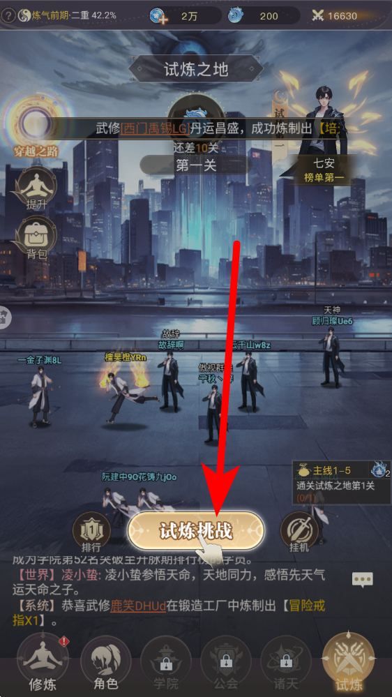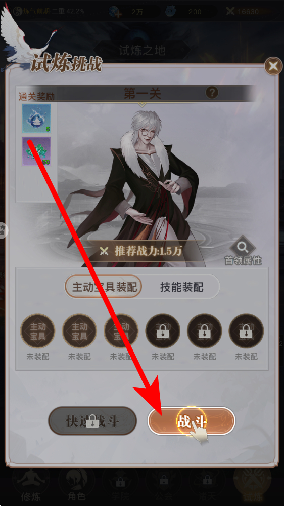 1、進(jìn)入試煉的界面,點擊中央試煉挑戰(zhàn)按鈕,選定目標(biāo)關(guān)卡如界面顯示的第一關(guān),查看推薦戰(zhàn)力與首領(lǐng)屬性,完成戰(zhàn)前的籌備。