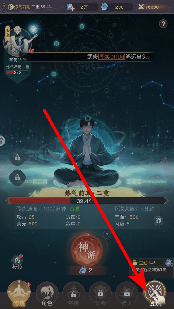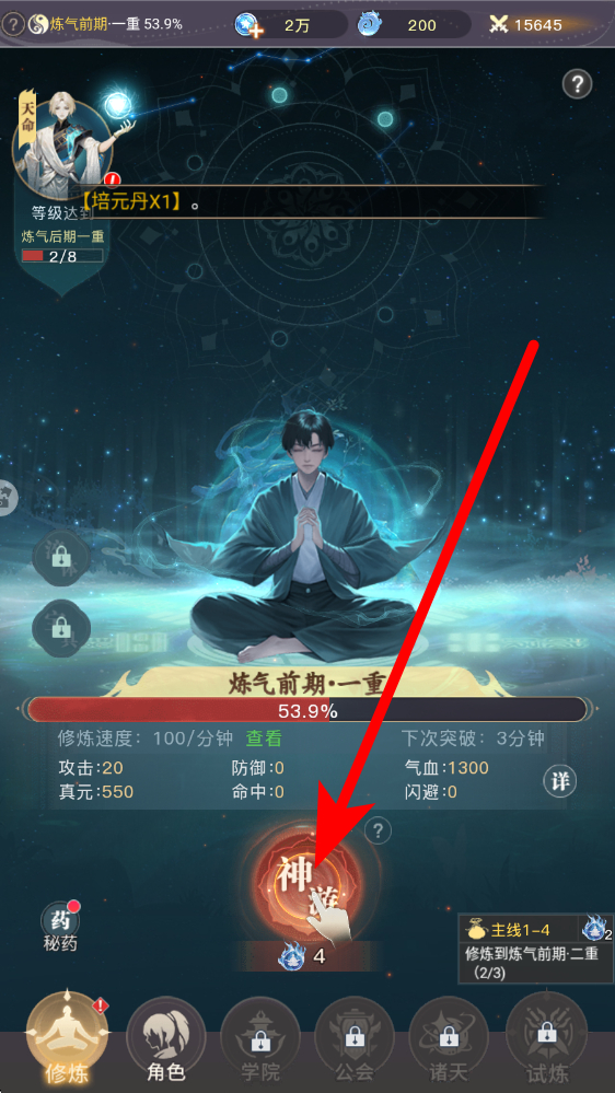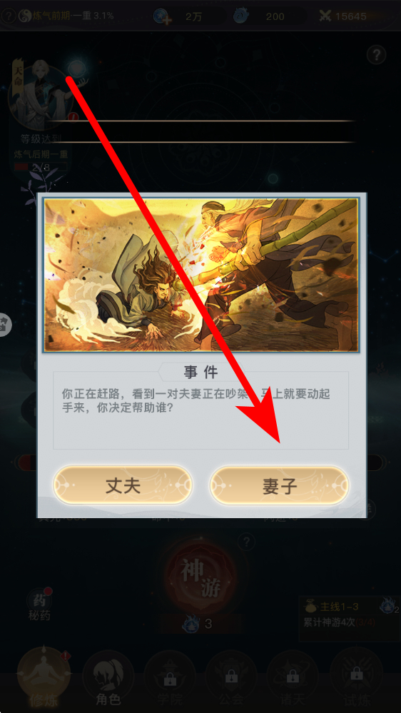 1、修煉界面底部點(diǎn)擊試煉按鈕,進(jìn)入主線試煉關(guān)卡,完成戰(zhàn)斗或事件抉擇夫妻吵架選幫一方,可獲培元丹等資源,提升修煉速度推動境界突破。
