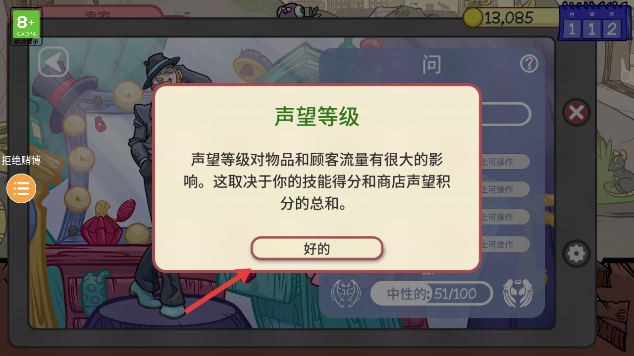 1、進(jìn)入游戲初期,先確?;A(chǔ)服務(wù)質(zhì)量,對(duì)到店顧客禮貌接待,精準(zhǔn)鑒定物品并給出合理價(jià)格,通過誠(chéng)信交易積累初始口碑,讓顧客主動(dòng)傳播當(dāng)鋪好評(píng)。