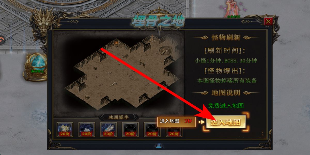 1、進(jìn)入地圖找到埋骨之地入口界面,確認(rèn)地圖免費進(jìn)入后,等待倒計時結(jié)束,點擊進(jìn)入地圖按鈕,踏入場景準(zhǔn)備挑戰(zhàn)怪物獲取裝備。