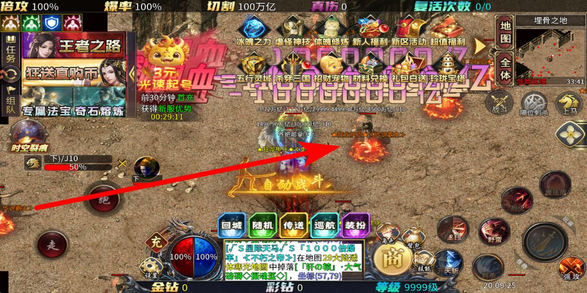 2、開啟自動戰(zhàn)斗功能,角色自動追擊怪物,憑借100%爆率與100萬億切割屬性快速清怪,留意BOSS每30分鐘刷新,優(yōu)先爭奪高收益目標(biāo)。