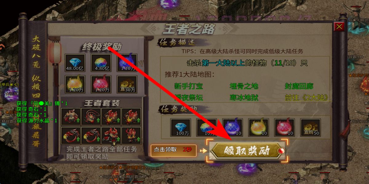 3、任務(wù)領(lǐng)獎刷怪時推進(jìn)王者之路任務(wù),當(dāng)擊殺第一大陸以上怪物數(shù)量達(dá)標(biāo),打開任務(wù)界面,點擊領(lǐng)取獎勵獲取鉆石奇石等道具助力成長。