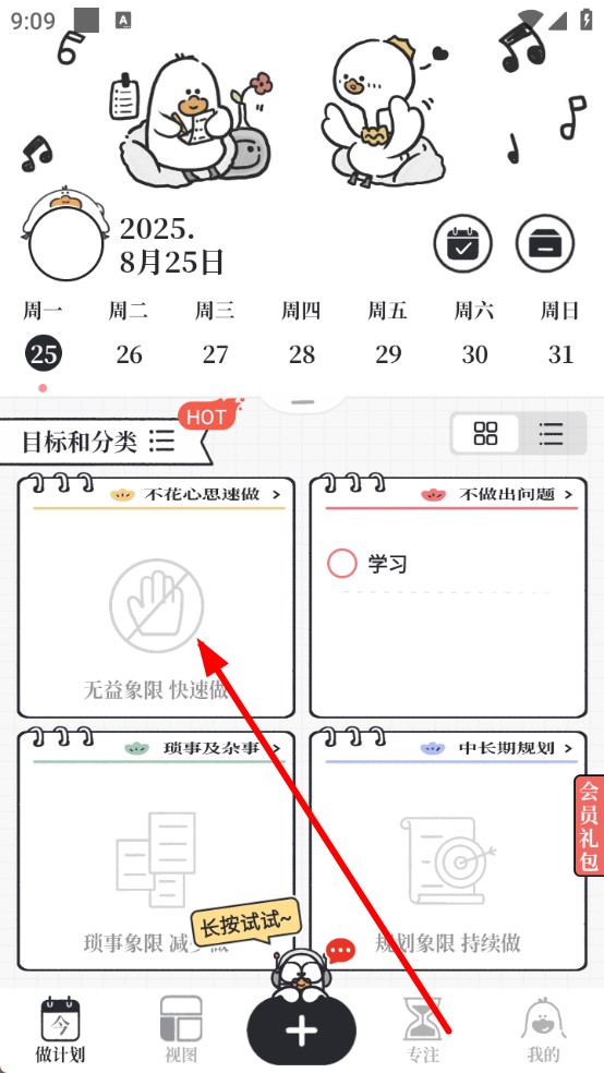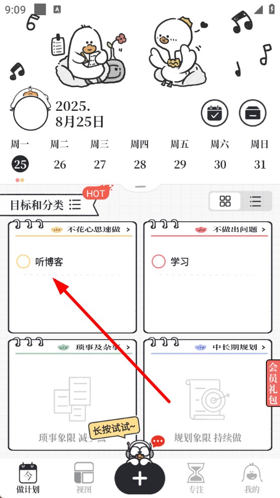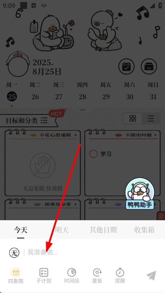 2、趣味交互設(shè)計:以卡通鴨鴨元素裝點界面,長按觸發(fā)任務添加、編輯等交互,操作反饋活潑,讓計劃制定過程輕松有趣,降低時間管理的枯燥感。