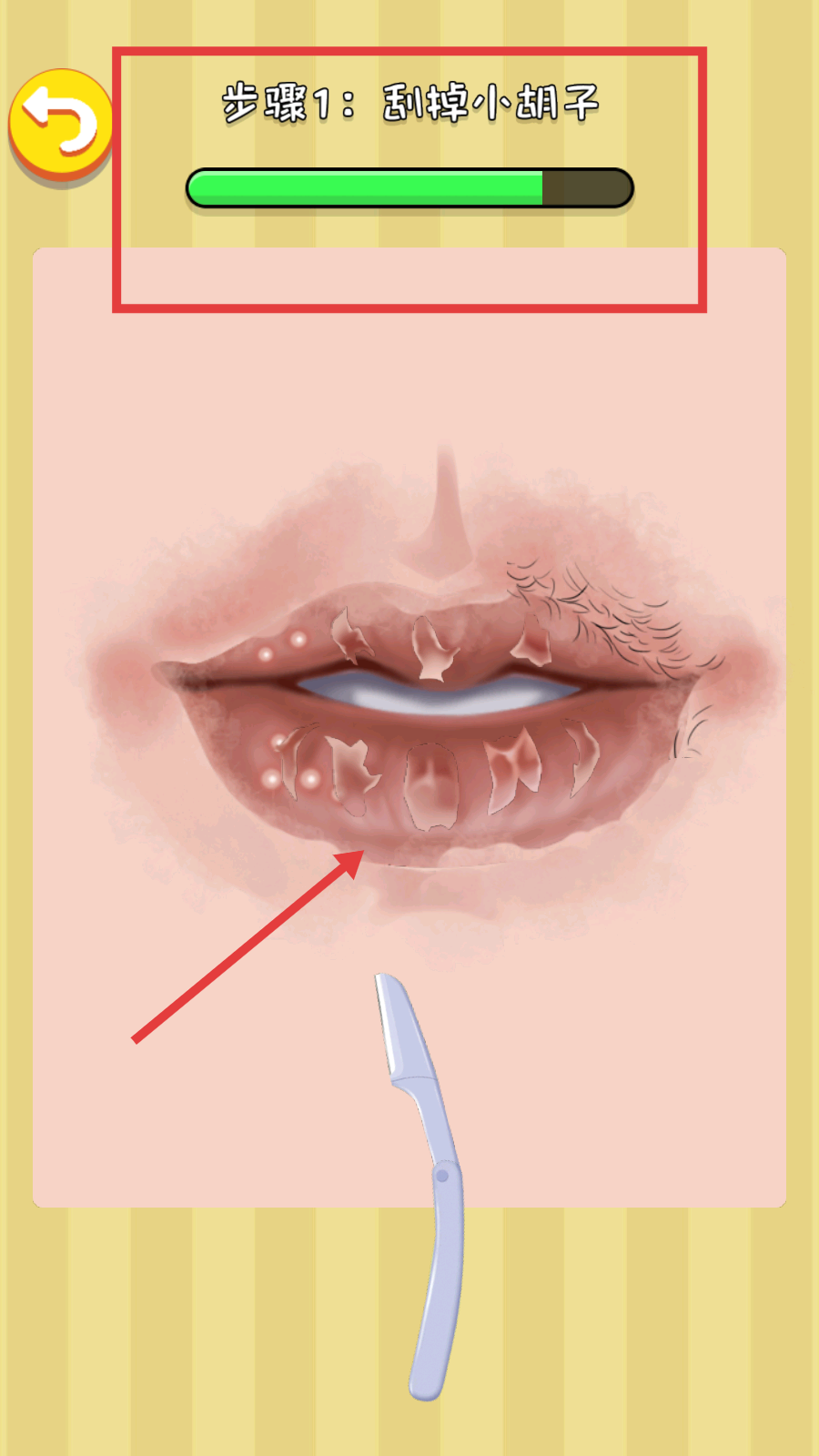 2、執(zhí)行【步驟1-刮掉小胡子】,用工具清理唇部胡須,推動(dòng)進(jìn)度條完成該步驟。