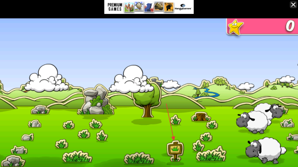 1、進(jìn)入游戲看到草原場景及綿羊按紅箭頭指向點(diǎn)擊牌子。