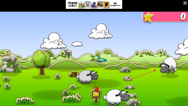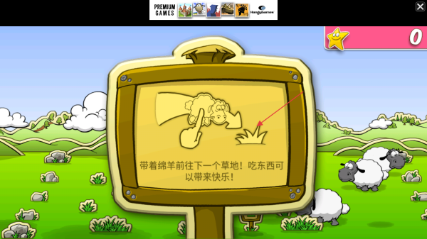 3、按紅箭頭方向引導(dǎo)綿羊移動去吃草并留意右上角星星分?jǐn)?shù)變化。