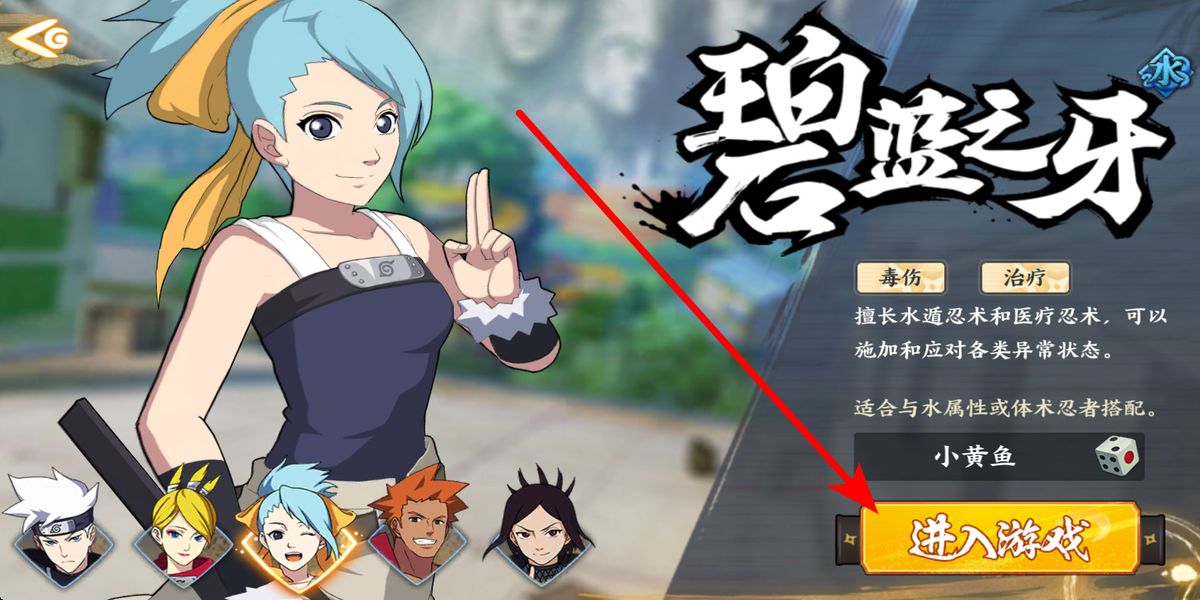 1、在角色界面選碧藍(lán)之牙,該角色擅長(zhǎng)水遁忍術(shù)與醫(yī)療忍術(shù),可施加和應(yīng)對(duì)異常狀態(tài),適配水屬性或體術(shù)忍者搭配,確認(rèn)后點(diǎn)擊進(jìn)入游戲開(kāi)啟冒險(xiǎn)。