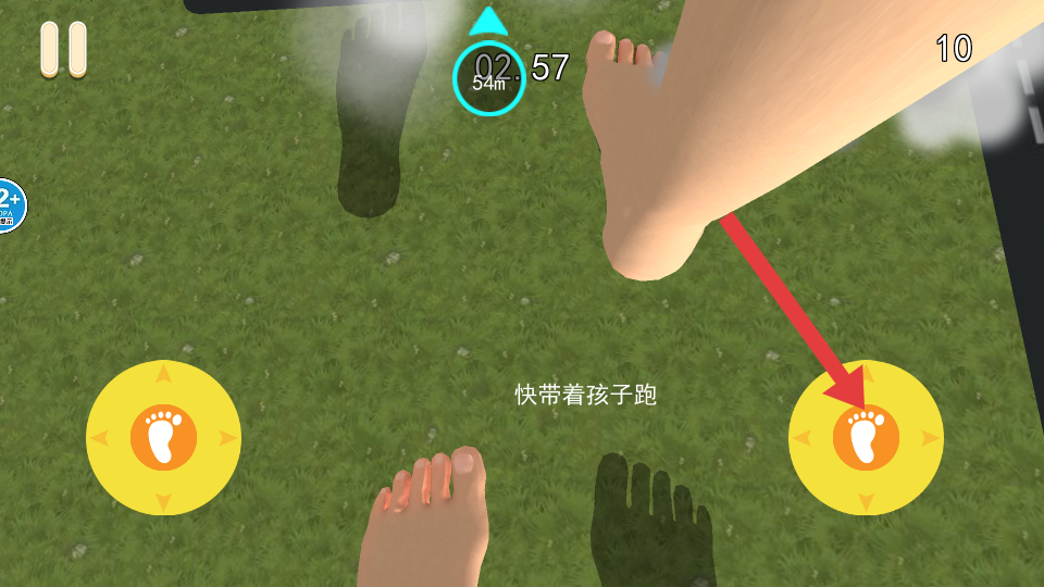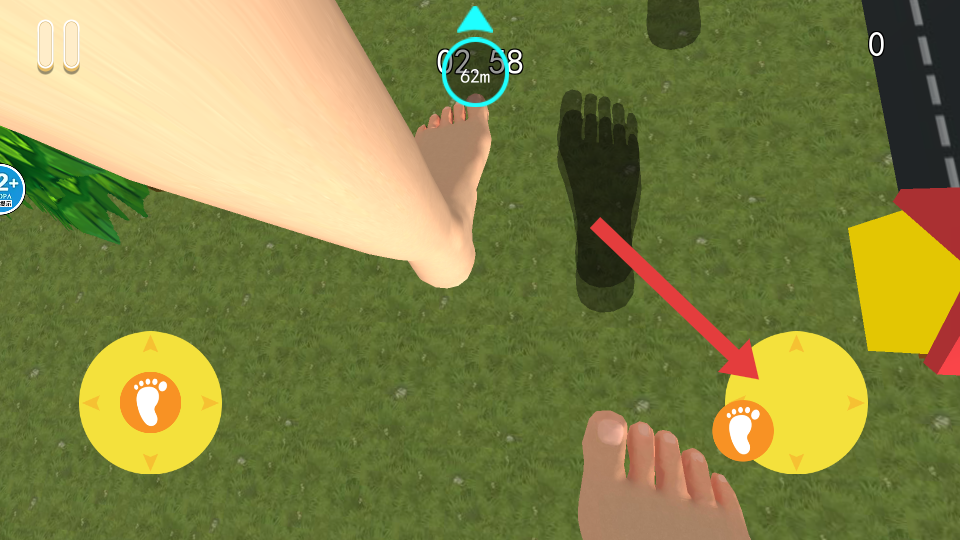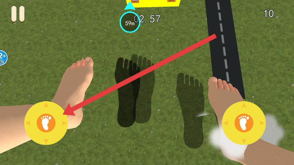 1、通過移動(dòng)來控制,點(diǎn)擊左右黃色腳印按鈕,操控角色左右移動(dòng),避開巨型腳印,防止被踩中而導(dǎo)致失敗。