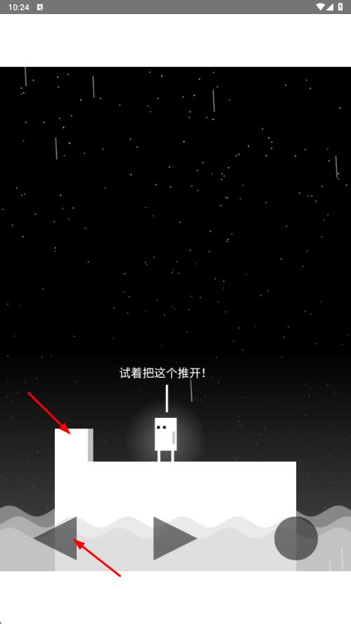 1、依據(jù)提示【試著把這個(gè)推開】,操控左側(cè)【箭頭按鈕】移動(dòng)角色,推動(dòng)前方白色方塊完成場景互動(dòng)。