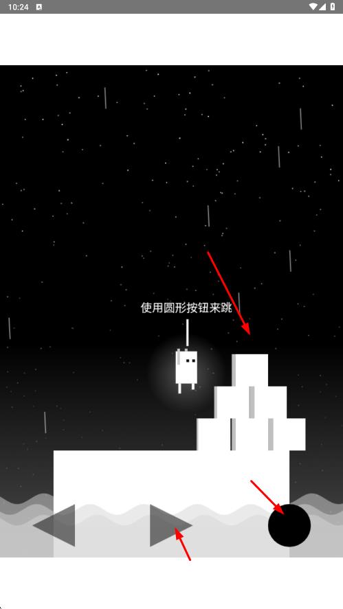 2、按照指引【使用圓形按鈕來跳】,點(diǎn)擊右側(cè)【圓形按鈕】觸發(fā)跳躍,跨越階梯狀白色障礙前進(jìn)。