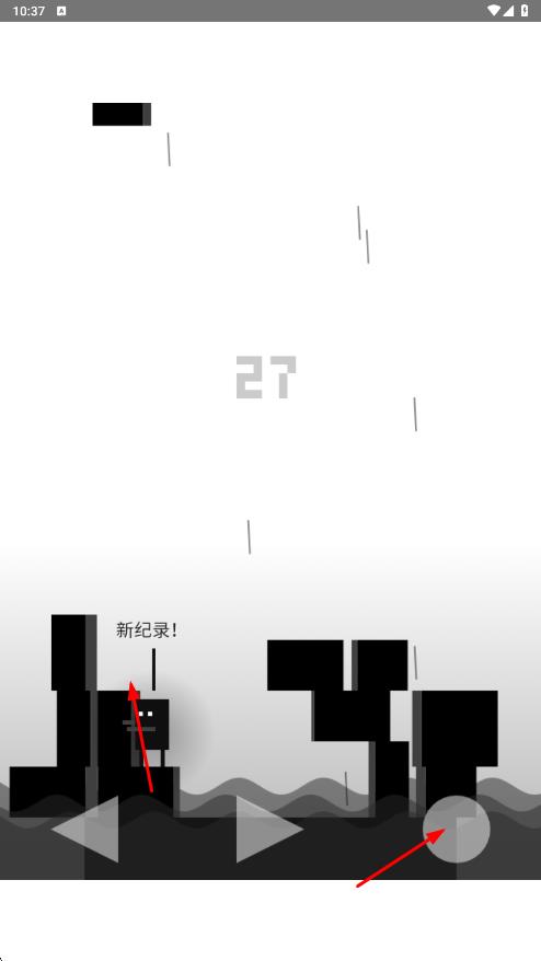 3、遇障礙點擊右側(cè)【圓形按鈕】跳躍,突破關卡達成【新紀錄-27】,持續(xù)挑戰(zhàn)更高分數(shù)。