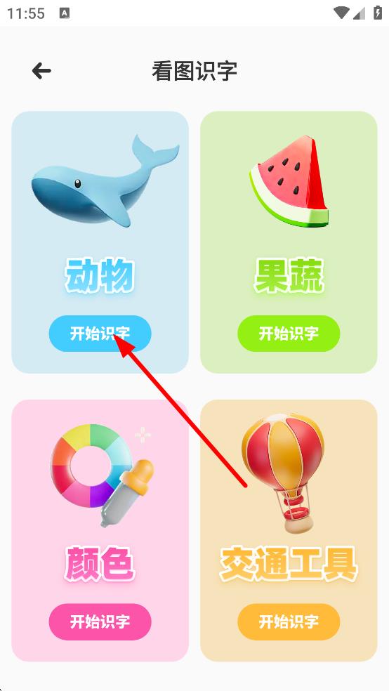 2、進入看圖識字頁面,可選擇動物,果蔬等類別,點擊對應(yīng)類別下的開始識字。