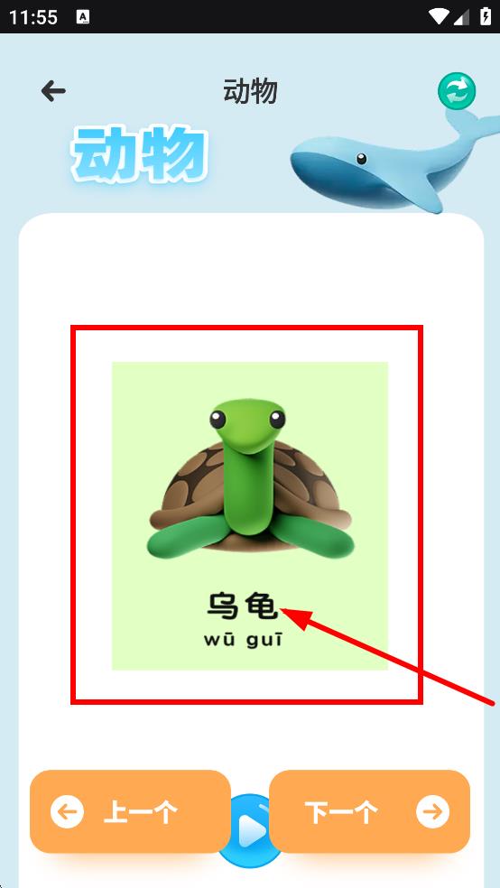 3、進入動物識字頁面,可看到烏龜?shù)葎游飯D片及文字、拼音,點擊上一個跟下一個切換學(xué)習(xí)內(nèi)容。