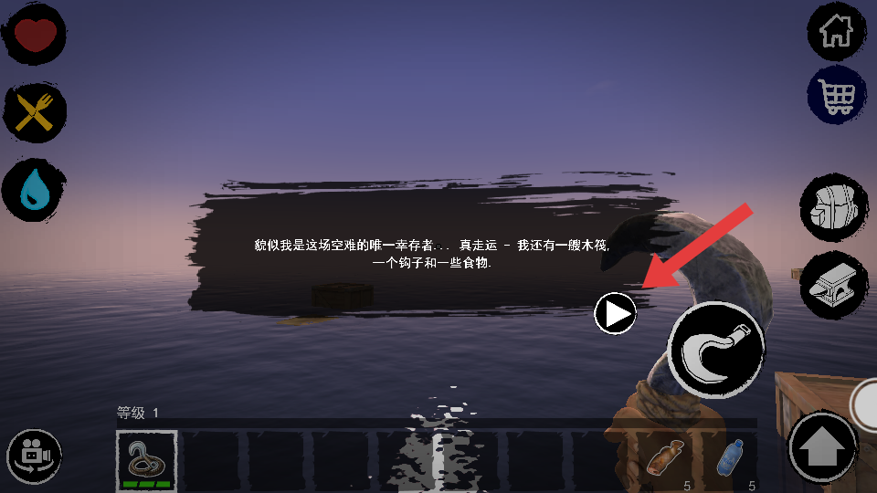 2、關注左上角生命、饑餓叉號、口渴水滴的狀態(tài),食用道具欄的食物、飲用淡水,保持生存的指標不耗盡。