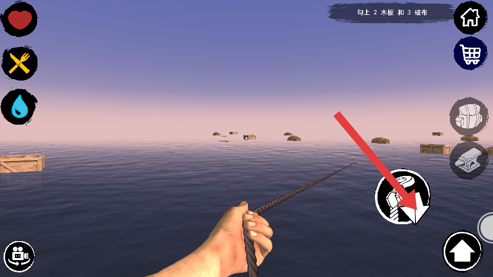 1、點擊右側鉤子按鈕,瞄準海上漂浮物、木箱、殘骸拋出鉤子,勾取木板、破布等基礎物資,用于建造或制作。