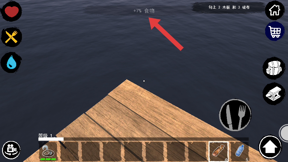 3、積累物資后,點擊右側制作按鈕,用收集的材料擴建木筏、增加木板、制作工具、升級鉤子,提升能力。