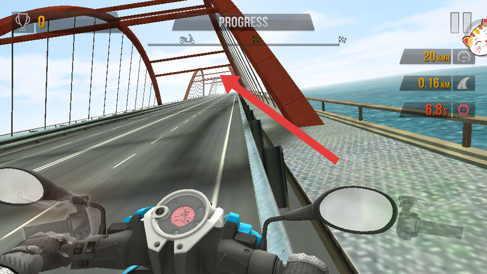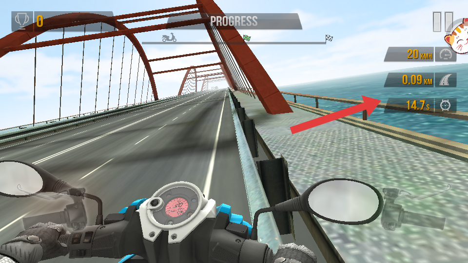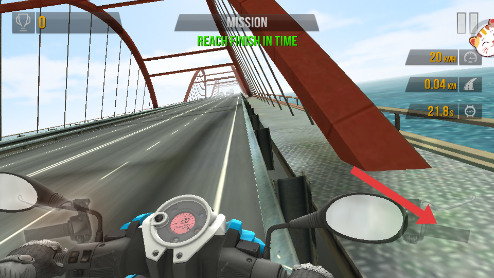 1、駕駛摩托車在橋梁賽道行駛,需在REACH FINISH IN TIME提示的規(guī)定時(shí)間內(nèi),抵達(dá)終點(diǎn)完成闖關(guān)。