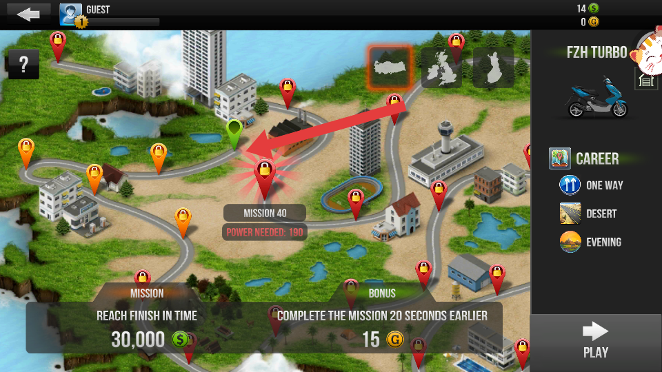 1、在地圖界面選擇帶標記的任務(wù)點,點擊PLAY進入關(guān)卡,完成REACH FINISH IN TIME限時抵達終點的目標。