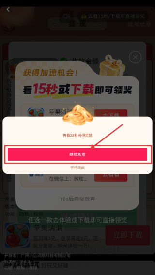 3、在視頻觀看界面,若彈出提示,點(diǎn)擊繼續(xù)觀看按鈕,完成視頻觀看以獲取獎(jiǎng)勵(lì)。