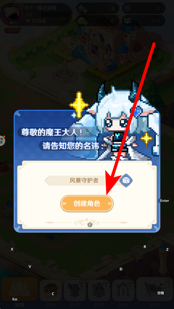 1、角色創(chuàng)建游戲開局彈出命名彈窗,可選用系統(tǒng)推薦名或自定義,點(diǎn)擊創(chuàng)建角色按鈕,確定魔王身份,此為浮空島冒險(xiǎn)的起始步驟,奠定后續(xù)發(fā)展基礎(chǔ)。
