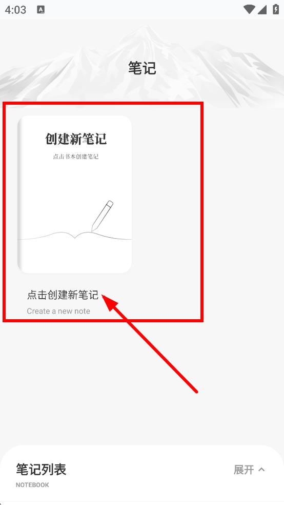 2、點(diǎn)擊筆記頁(yè)面,點(diǎn)擊點(diǎn)擊創(chuàng)建新筆記,進(jìn)入創(chuàng)建筆記。