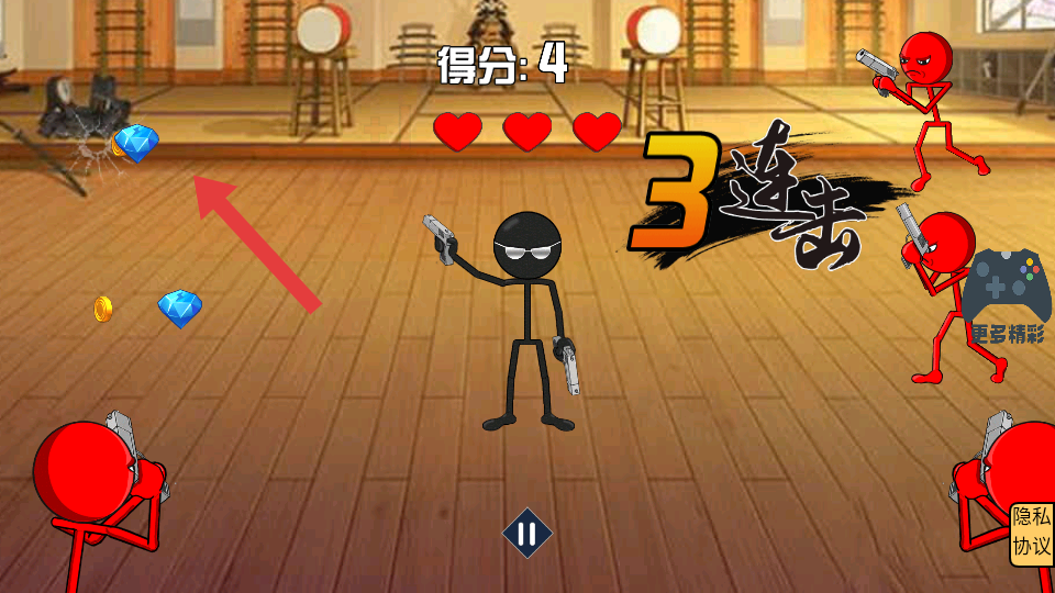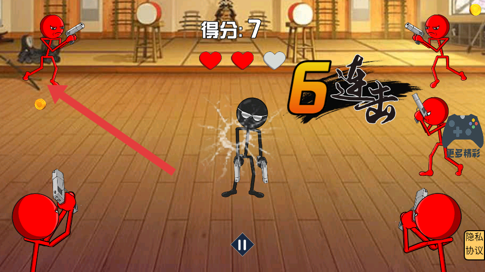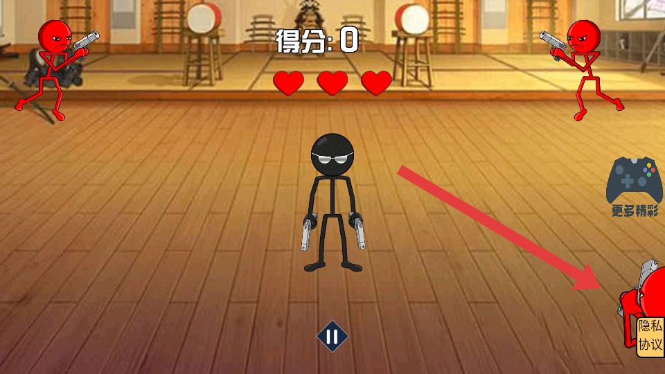 1、操控黑色火柴人,面對兩側(cè)及周圍出現(xiàn)的紅色持槍敵人,快速瞄準(zhǔn)射擊,注意初始3顆愛心代表生命,別讓敵人近身攻擊。