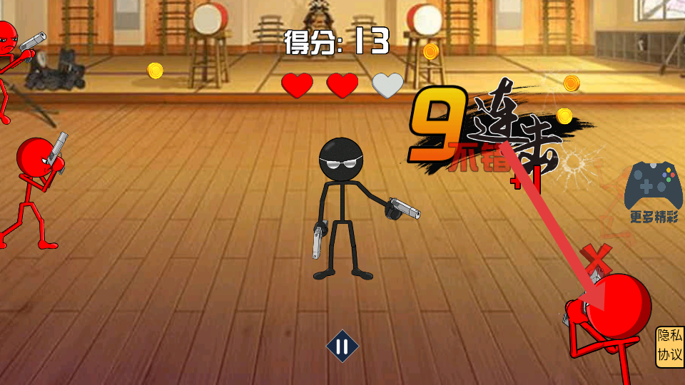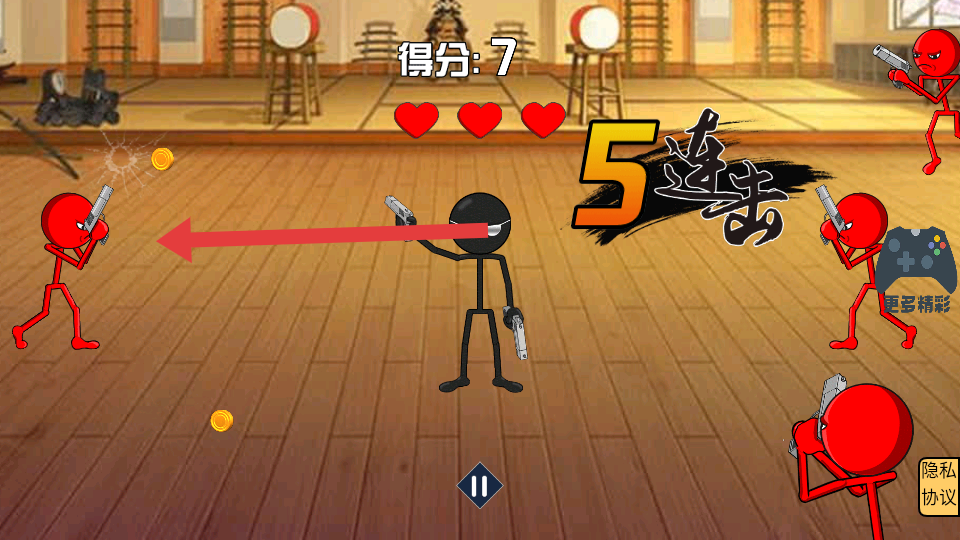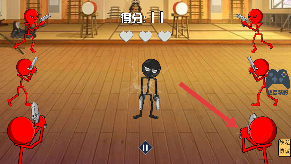 1、進(jìn)入游戲,操控黑色火柴人,面對(duì)四周紅色持槍敵人,快速瞄準(zhǔn)射擊,利用優(yōu)勢(shì),優(yōu)先攻擊近身敵人,守護(hù)初始愛(ài)心。