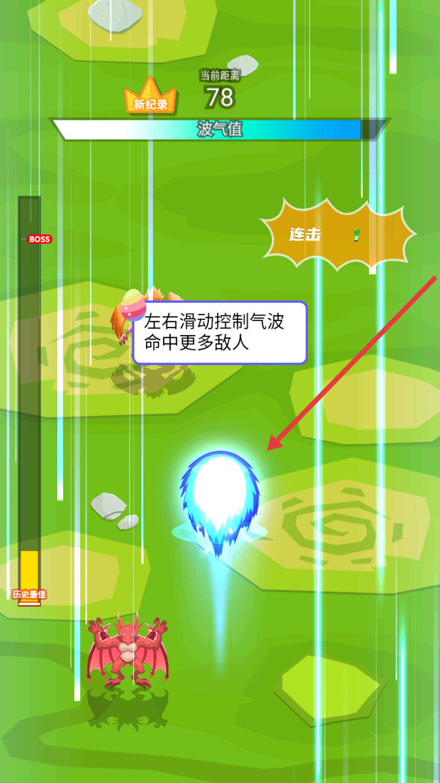 2、戰(zhàn)斗過(guò)程中,左右滑動(dòng)屏幕控制氣波方向,盡量命中更多敵人,以此積累連擊數(shù)與波氣值。
