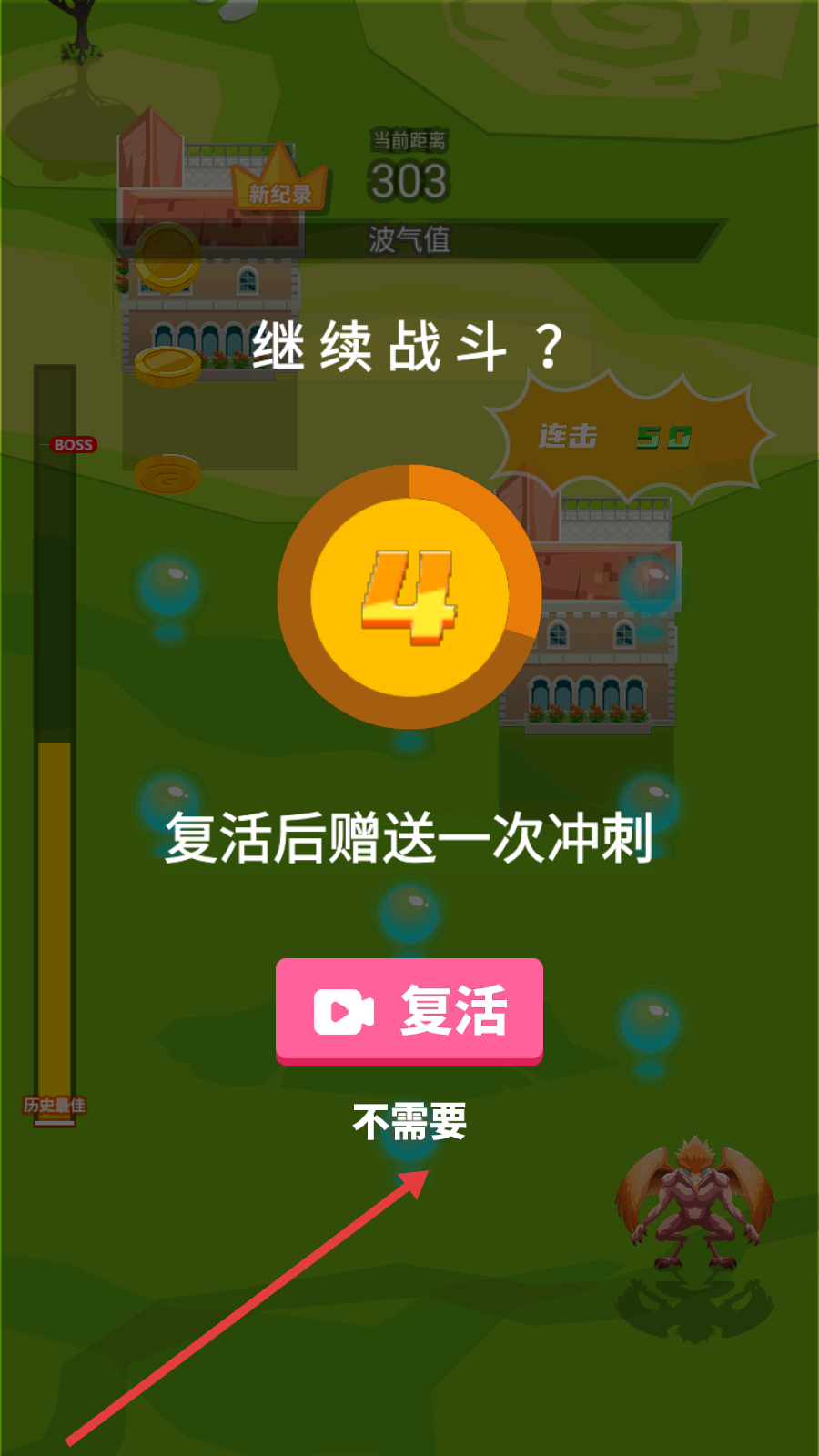 3、若挑戰(zhàn)失敗,可選擇復(fù)活觀看廣告繼續(xù)戰(zhàn)斗,也能點(diǎn)擊不需要直接重新開(kāi)局,沖擊更遠(yuǎn)距離。
